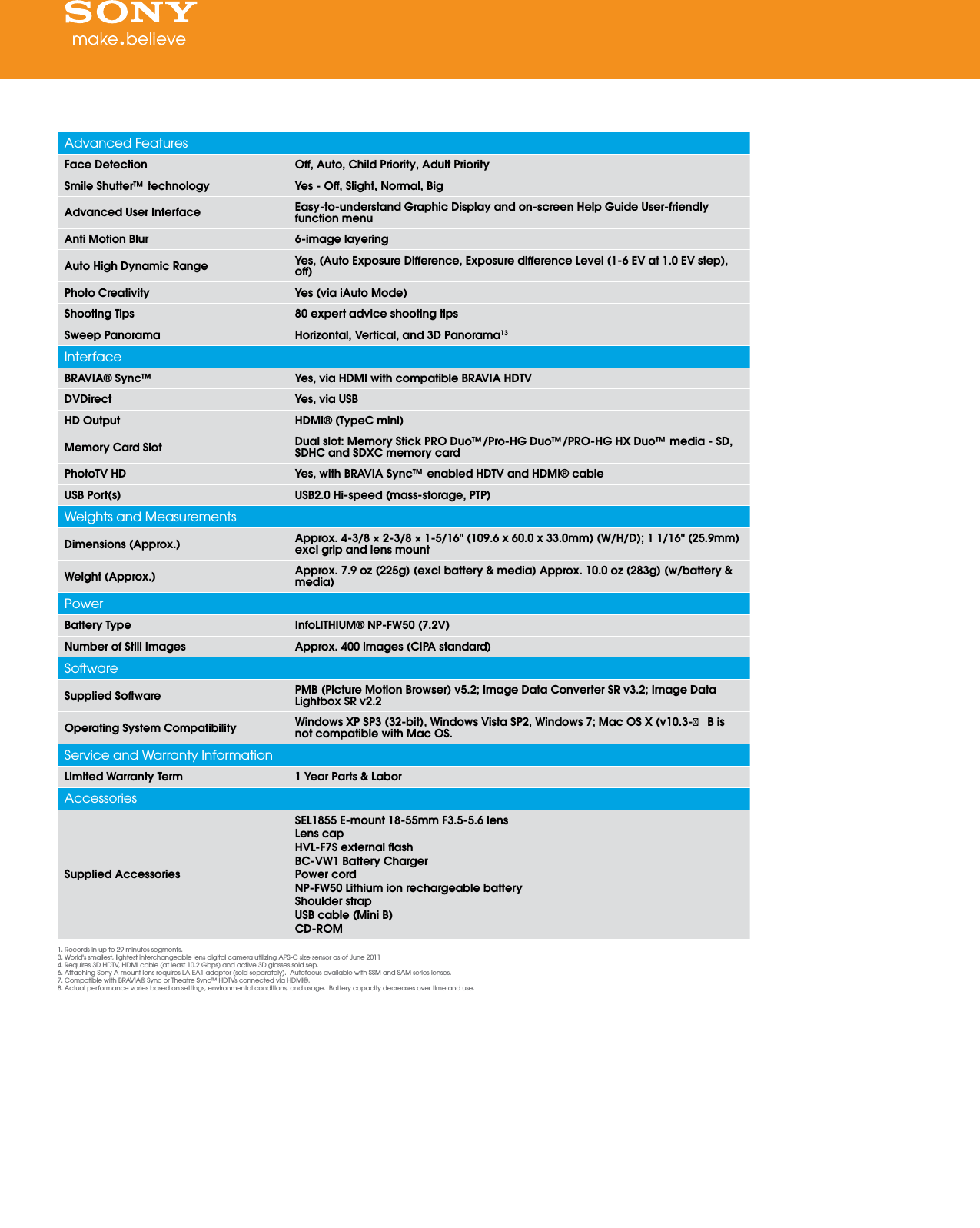 Sony a NEX C3K digital camera 1855mm OSS lens overview and full product specs on CNETPlayMemories Mobile becomes Imaging Edge Mobile!NEXC3K Included components may vary by country or region of purchase NEXC3, BCVW1, SEL1855 Specifications;